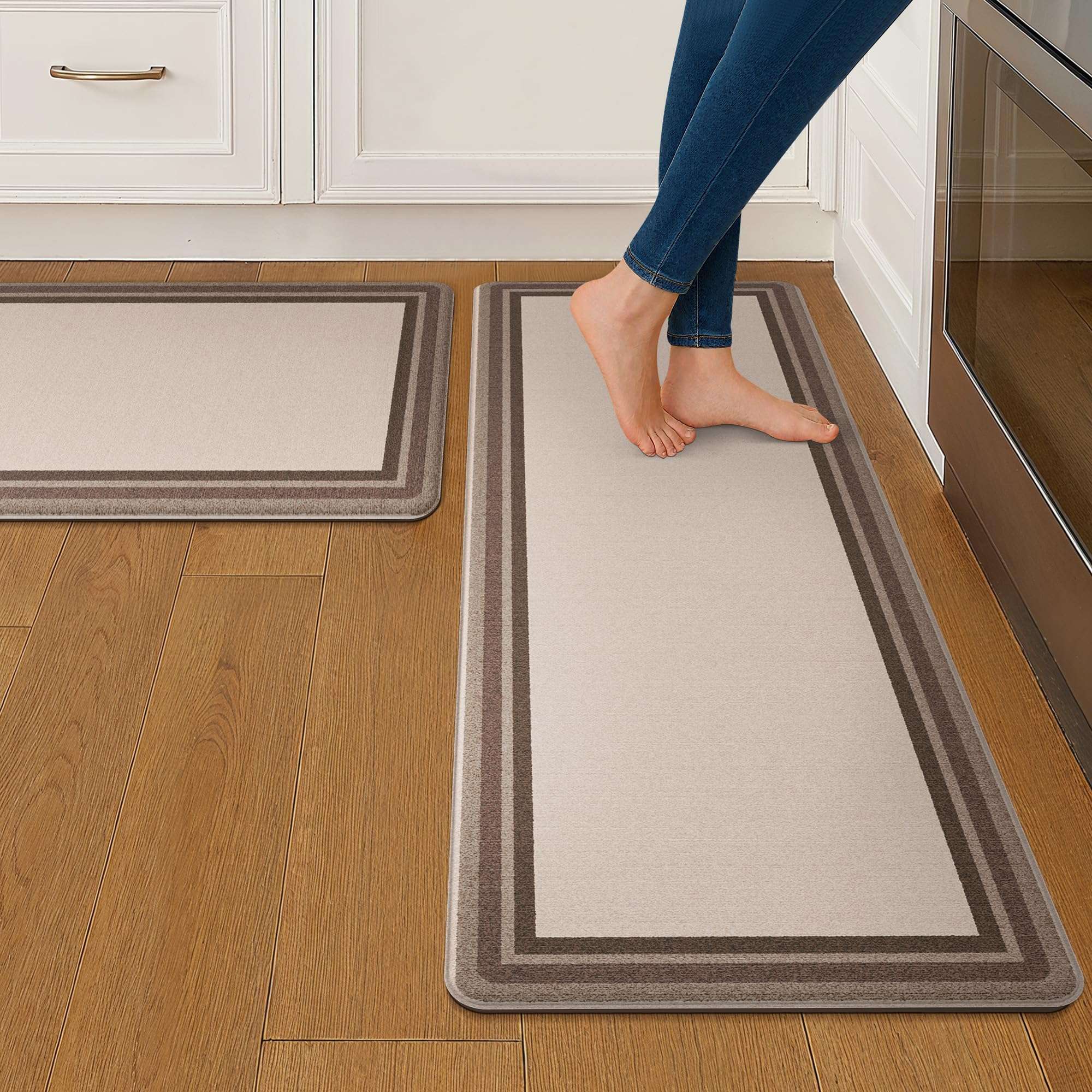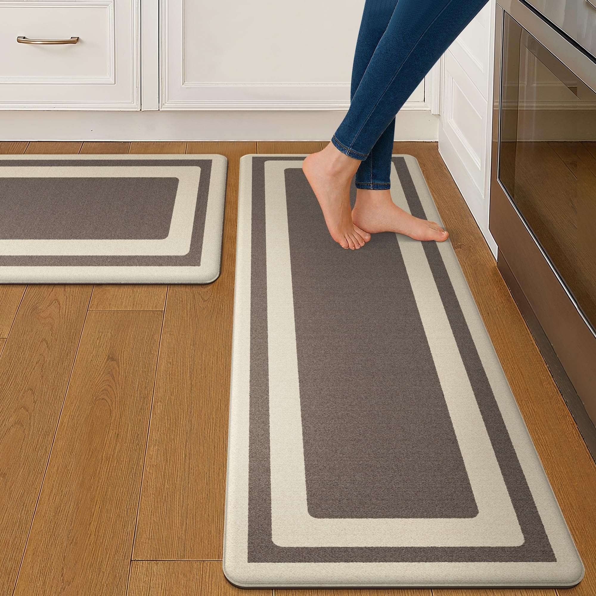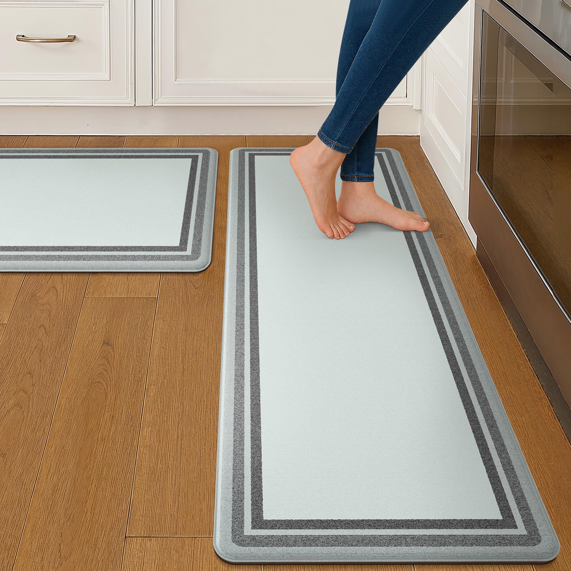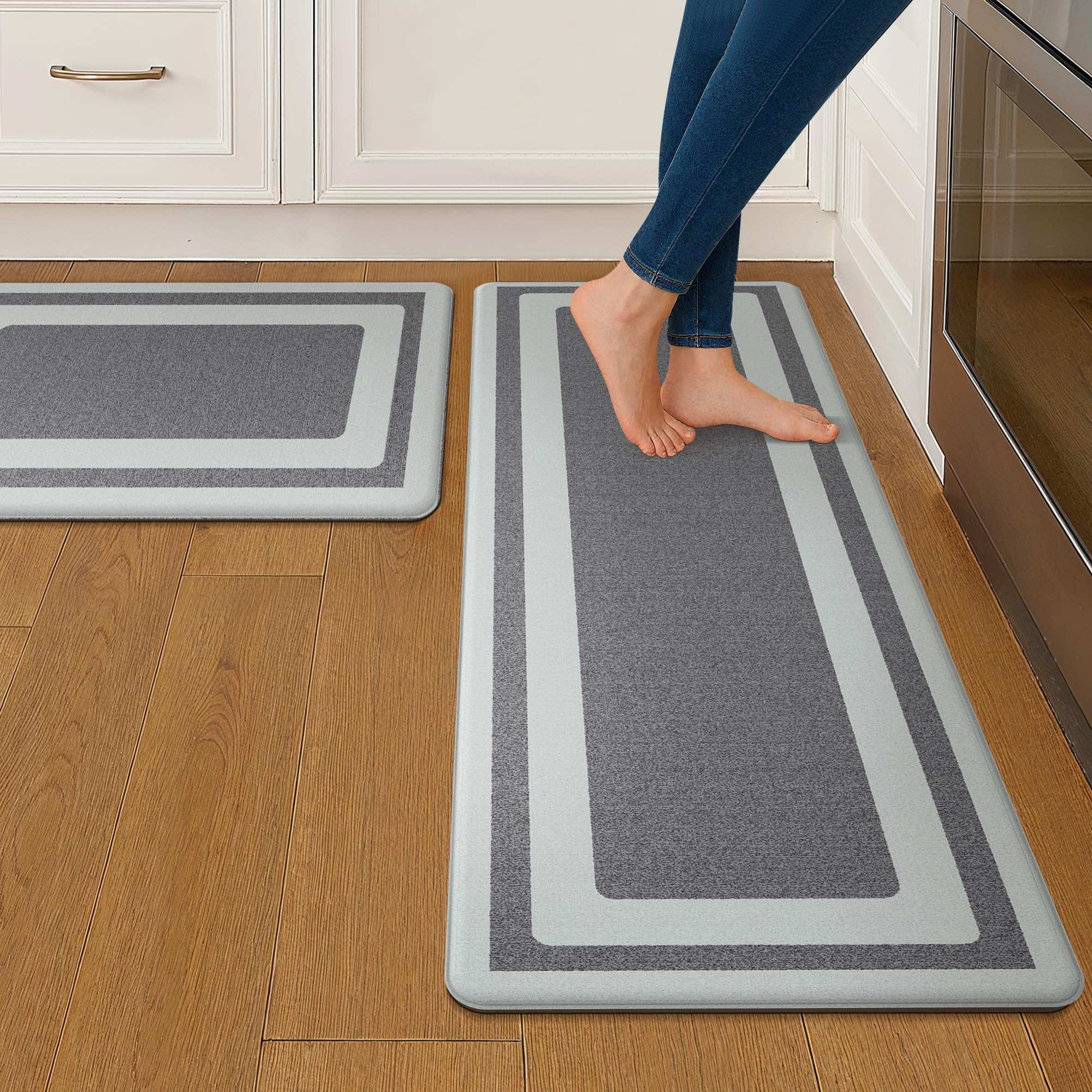 Anti-Fatigue kitchen rugs cushion your feet during prolonged periods of standing. They can be used in kitchen, living room, office, laundry room or even as pet mat.
